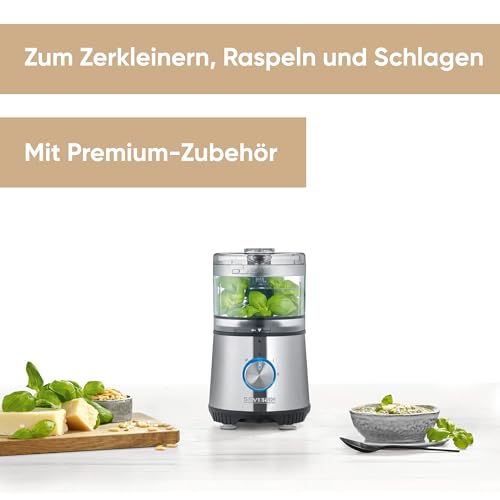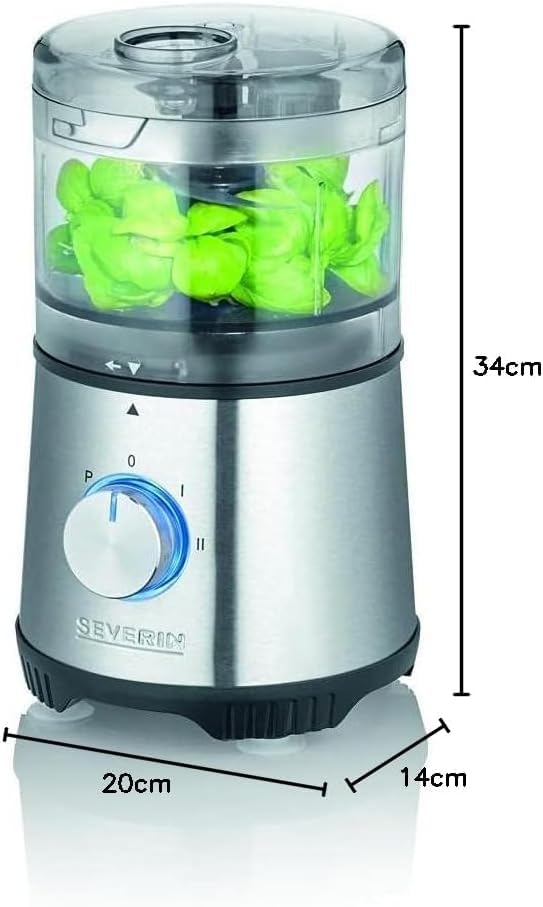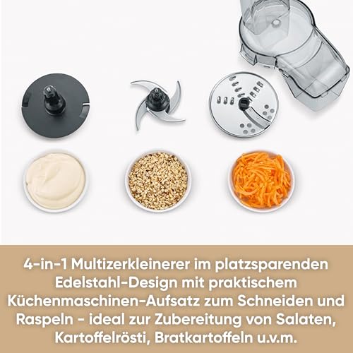 L’aide de cuisine idéale : Hachoir compact polyvalent pour couper et râper ainsi que pour la préparation de mayonnaise, crème fouettée et bien plus encore Meilleurs résultats de coupe grâce à 4 lames en acier inoxydable de haute qualité, détermination individuelle du degré de broyage à l’aide d’un bouton rotatif pratique Utilisation sûre : Interrupteur de sécurité qui met en route l’appareil uniquement lorsqu’il est fermé, Maintien ferme grâce aux pieds en caoutchouc antidérapants Qualité allemande – Garantie de 2 ans, Puissance : 400 W, Surface en plastique de haute qualité, Nettoyage facile grâce aux pièces amovibles allant au lave-vaisselle Contenu de la livraison : 1 Hachoir polyvalent, KM 3865, Dimensions (LxlxH): 14 x 20 x 34,5 cm, Poids : 1,69 kg, Couleur : Inox/Noir