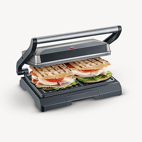Multifonction – Utilisez l’appareil de cuisson comme gril viande, panini ou sandwich maker : grâce à ses deux plaques de cuissons, il garantit des menus variés et permet de cuire toutes sortes d’aliments Cuisine saine – Grâce aux plaques antiadhésives, aucun ajout de matière grasse est nécessaire et les restes d’aliments se détachent facilement. Le récupérateur de graisse amovible facilite aussi le nettoyage. Design compact – Doté d’une surface de cuisson d’environ 23 x 14,5 cm, ce gril de table est rapidement prêt à l’emploi. Peu encombrant, il est idéal pour les petits espaces et se range simplement Sûr & Pratique – Cet appareil à sandwich possède un revêtement laqué résistant à la chaleur et un thermostat réglable avec voyant lumineux. La poignée inox assure le maniement simple de l’appareil Livraison & Détails – Gril compact à double plaque pour cuisson saine des aliments, avec revêtement antiadhésif, bac récupérateur de graisse amovible et voyant lumineux, 800 W, 2394 Qualité allemande – Garantie 2 ans – Les produits SEVERIN sont performants par leur conception, leur facilité d’utilisation et leur durée de vie Bouton marche-arrêt : Non