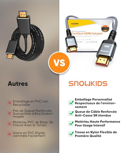Snowkids 8K Câble HDMI 2M, Ultra Haut Débit 48Gbps 8K@60Hz 4K@120Hz Cordon HDMI 2.1, HDR10+ ARC eARC HDCP 2.2&2.3 Compatible avec TV PC Monitor Projecteur PS-5 X-box