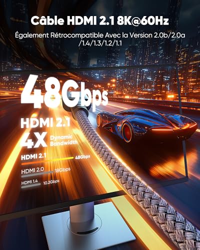 Câble HDMI 2.1 : Prend en charge la résolution ultra-haute vitesse 10K 8K@60Hz, 4K@120Hz, 4K@60Hz, 2K@144Hz, rétrocompatible avec la version HDMI 2.0/1.4/1.3/1.2/1.1 pour une transmission fluide et une expérience audiovisuelle améliorée. HDMI Ultra Haute Vitesse : Supporte un taux de transmission maximal de 48 Gbps, HDR, HDCP 2.2 & 2.3,…