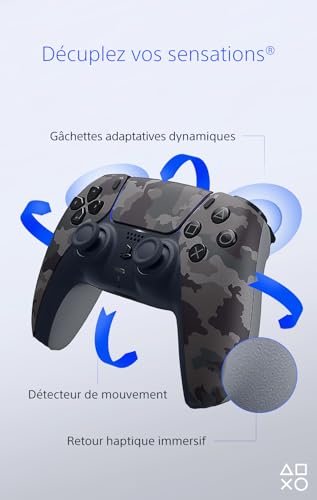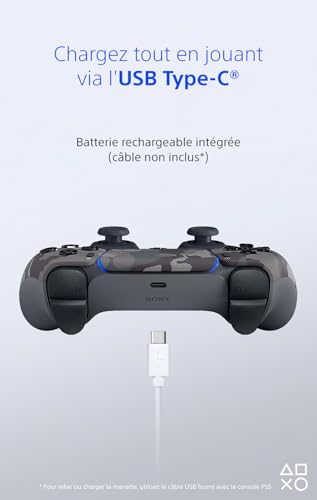 Manette sans fil DualSense pour PS5, Pour une expérience de gaming plus intense et innovante, Compatible avec PC via une connexion filaire en USB Caractéristiques : Haut-parleur et microphone intégrés, Prise casque, Détection de mouvement 6 axes, Port USB-C, Retour haptique Technologie Create : production et partage du contenu vidéoludique avec les autres joueurs, Gachettes adaptatives pour une expérience immersive Batterie rechargeable intégrée, possibilité de jouer et de recharger la batterie simultanément Contenu : 1 x Sony Manette sans fil DualSense pour PS5, Batterie rechargeable, Dimensions : 16×6.6×10.9 cm (LxHxL), Poids : 280 g, Guide d’utilisation, Couleur : Camouflage