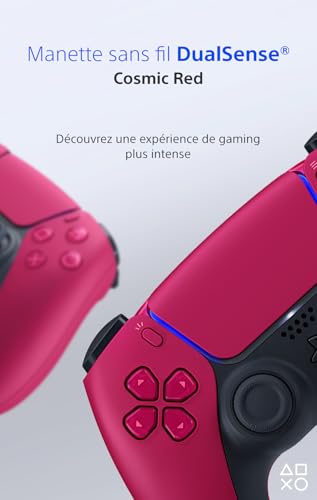 Manette sans fil DualSense pour PS5, Pour une expérience de gaming plus intense et innovante, Compatible avec PC via une connexion filaire en USB Caractéristiques : Haut-parleur et microphone intégrés, Prise casque, Détection de mouvement 6 axes, Port USB-C, Retour haptique Technologie Create : production et partage du contenu vidéoludique avec les autres joueurs, Gachettes adaptatives pour une expérience immersive Batterie rechargeable intégrée, possibilité de jouer et de recharger la batterie simultanément Contenu : 1 x Sony Manette sans fil DualSense pour PS5, Batterie rechargeable, Dimensions : 16×6.6×10.9 cm (LxHxL), Poids : 280 g, Guide d’utilisation, Couleur : Cosmic Red