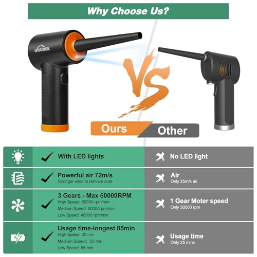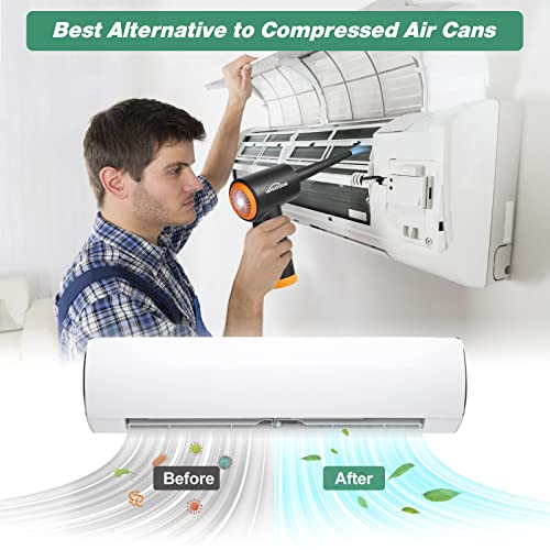 Souffleur Air Comprimé : Le dépoussiéreur électrique à air comprimé adopte une nouvelle génération de moteur sans balai, dont la vitesse peut atteindre 60000RPM, et qui possède une forte puissance de vent et de nettoyage. La conception du vent à 3 vitesses permet de basculer librement entre 3 modes de flux d’air (45000RPM, 50000RPM et 60000RPM) pour générer un flux d’air super puissant, nettoyer différents équipements, et enlever les débris et la poussière de tout équipement électronique. Écologique et économe en énergie : Batterie Li-ion 6000mAh intégrée, le dépoussiéreur à air peut fonctionner en continu pendant 30 à 50 minutes, conception de chargement par câble USB-C, qui peut être réutilisé, remplaçant parfaitement l’air comprimé en boîte. Les lumières LED s’allument automatiquement, le soufflage de la suie et l’éclairage sont deux en un, vous permettant de nettoyer facilement les coins sombres. Le design ergonomique apporte une grande commodité à votre nettoyage. Facile à transporter et à utiliser : La buse électrique du dépoussiéreur est de petit volume, peu encombrante et facile à transporter. Confortable dans la main, simple à utiliser, il suffit d’appuyer sur l’interrupteur et vous êtes prêt à commencer votre voyage de nettoyage. Protection de sécurité et souffleur d’air : Comparé au traditionnel “dépoussiéreur en boîte d’ordinateur”, notre nouveau dépoussiéreur électrique possède les caractéristiques de protection (surintensité, surtension, surcharge, court-circuit). Il est sûr, pratique et garanti dans son utilisation, ce qui rend son utilisation plus facile et plus rassurante pour vous. Large éventail d’utilisations : Multi-fonction 5 jeux de buses, différents lieux de nettoyage, remplacement des accessoires appropriés, adapté au nettoyage dans différentes scènes, peut nettoyer les claviers d’ordinateur, les cartes graphiques, les lentilles d’appareil photo et les claviers mécaniques, les sièges et les volets, etc. Le dépoussiéreur à air comprimé est le meilleur choix pour le nettoyage de votre maison, le nettoyage industriel et le nettoyage de votre voiture.