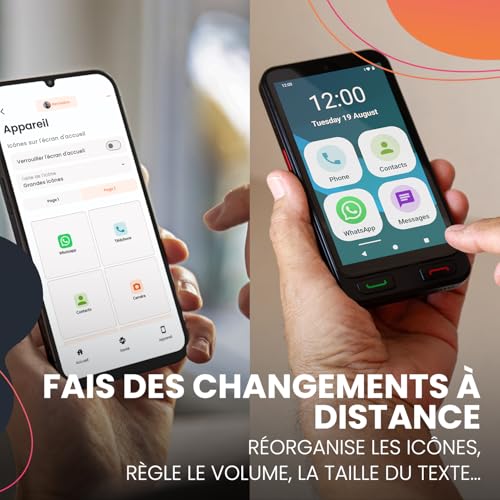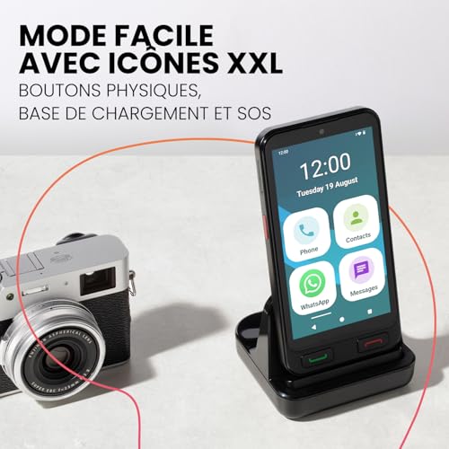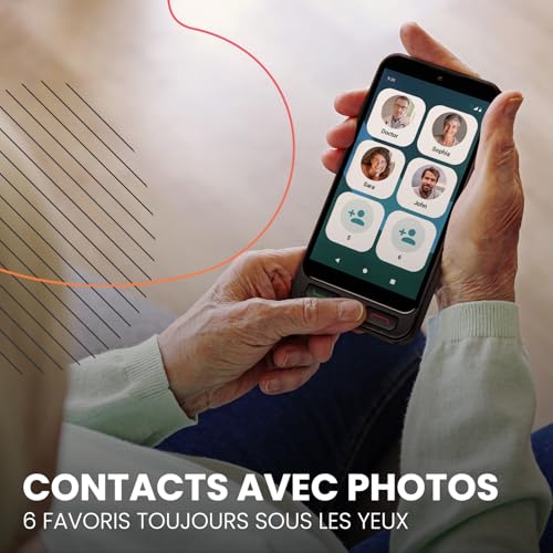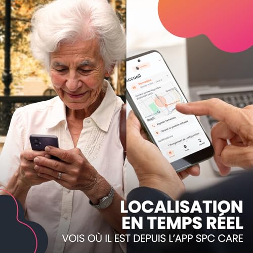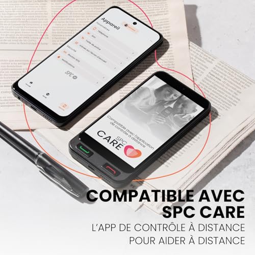 | FACILE À UTILISER ET DE TAILLE COMPACTE | Un portable débloqué pour personnes âgées avec écran 5’’, plus facile à manier et à tenir d’une seule main, avec coque de protection noire incluse. Boutons physiques pour répondre et raccrocher et interface simplifiée grâce au « Mode facile » avec des raccourcis XXL personnalisables vers les applications les plus utilisées telles que WhatsApp ou l’appareil photo. | CONFIGURATION GUIDÉE ET CHARGE SANS EFFORT | Un assistant de démarrage vous accompagne dès la première utilisation pour tout configurer à votre goût. Possibilité de choisir entre le Mode Android ou le « Mode facile », et de personnaliser la taille de la police ou la disposition des icônes en taille XXL. Et grâce à sa base, la charge est très facile : il suffit de le poser, même avec la coque de protection incluse dans cette version exclusive Destockage Multimédia. | RÉGLAGES À DISTANCE DEPUIS VOTRE MOBILE | Compatible avec l’application gratuite SPC Care (Android et iOS), qui vous permet de réorganiser à distance les icônes, d’augmenter le volume ou d’augmenter la taille de la police. Et tout à distance : vous gérez tout depuis votre mobile, pour qu’ils l’utilisent normalement. | LOCALISATION EN TEMPS RÉEL | SPC Care vous permet également de consulter la localisation en direct, sans avoir à les interrompre avec des appels. Savoir s’ils sont rentrés à la maison ou s’ils sont encore chez le médecin est possible simplement en ouvrant l’application gratuite. | BOUTON SOS ET ALERTES DE SÉCURITÉ | Le bouton SOS sur le côté vous permet d’appeler à l’aide instantanément : il permet un cycle d’appels et de SMS aux contacts d’urgence configurés, en répétant jusqu’à trois fois s’il n’y a pas de réponse. De plus, l’application SPC Care reçoit des notifications si le téléphone reste inutilisé pendant plusieurs heures ou si la batterie du téléphone est faible. | UN VRAI SMARTPHONE, ADAPTÉ À EUX | Ce smartphone Android pour personnes âgées intègre un appareil photo arrière de 13 MP et un appareil photo avant de 5 MP avec flash pour des appels vidéo et des photos avec les proches. Mémoire interne de 64GB, déverrouillage par empreinte digitale ou visage et compatibilité eSIM. Toutes les fonctions actuelles dans un téléphone simple et facile à utiliser.