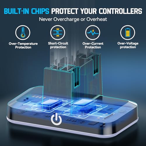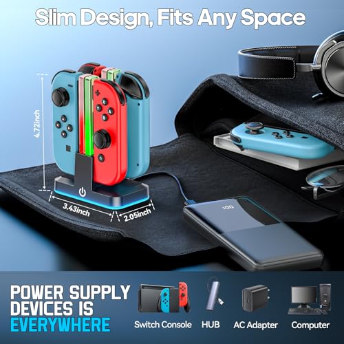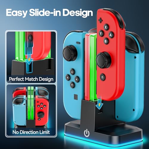 REMARQUE: LE PRODUIT N’EST PAS COMPATIBLE AVEC NINTENDO SWITCH 2. CHARGE SIMULTANÉE À 4 MANETTES: Chargez jusqu’à 4 manettes Switch OLED ou Switch à la fois grâce à la conception coulissante, compatible avec les manettes gauche et droit. Parfait pour les sessions de jeu multijoueurs ou la recharge rapide. CHARGE RAPIDE INTELLIGENTE ET SURVEILLANCE EN TEMPS RÉEL: Équipé d’une puce intelligente pour fournir une charge rapide à courant élevé (2,5 heures de charge complète) tout en assurant la sécurité. Des indicateurs LED indiquent l’état de charge (rouge = charge, vert = complètement chargé/en veille). 9 EFFETS D’ÉCLAIRAGE PERSONNALISABLES: Personnalisez votre configuration avec 7 couleurs monochromes (rouge, vert, bleu, pomme, cyan, jaune, blanc) et 2 modes de dégradé dynamique (cycle rapide/lent). Appuyez brièvement sur l’interrupteur d’éclairage pour basculer les effets sans effort. CONCEPTION COMPACTE ET SÛRE: La taille compacte (0,5 x 3,45 x 4,72 pouces) s’adapte à n’importe quel espace. Construit avec une protection contre les surcharges et une technologie anti-court-circuit. Comprend un câble de charge durable et nécessite une surface plane et bien ventilée pour une utilisation optimale ASSURANCE DE LA SÉCURITÉ ET COMPATIBILITÉ: Certifié pour un fonctionnement en toute sécurité dans des environnements secs. Évite la surchauffe grâce à la gestion automatique de l’alimentation. Remarque : Non compatible avec les manettes SW2.