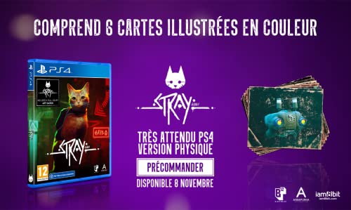 Perdu, seul et séparé de sa famille, un chat errant doit percer un mystère ancestral pour s’échapper d’une ville oubliée. Percez un mystère ancestral pour vous échapper de la cyber-cité oubliée de Stray Stray est un jeu d’aventure à la troisième personne dans lequel vous incarnez un chat qui arpente les rues éclairées au néon et les bas-fonds miteux d’une cyber-cité en déclin aux décors très détaillés. Explorez chaque recoin, défendez-vous contre des menaces inattendues, et percez les mystères de cet endroit inhospitalier peuplé d’étranges droïdes et de dangereuses créatures Découvrez le monde à travers les yeux d’un chat et interagissez avec l’environnement de façon ludique. Vous devrez faire preuve de furtivité, d’agilité et de fantaisie, et parfois agacer au maximum les habitants atypiques de cet univers mystérieux. Au cours de l’aventure, le chat se liera d’amitié avec un petit drone volant nommé B-12. Ensemble, ils devront trouver un moyen de s’en sortir Ne passez pas à côté de l’occasion d’incarner un chat dans cette aventure à la troisième personne totalement unique développée pour la PlayStation 4 par BlueTwelve Studio L’édition physique Playstation 4 est accompagnée de 6 cartes illustrées en couleur
