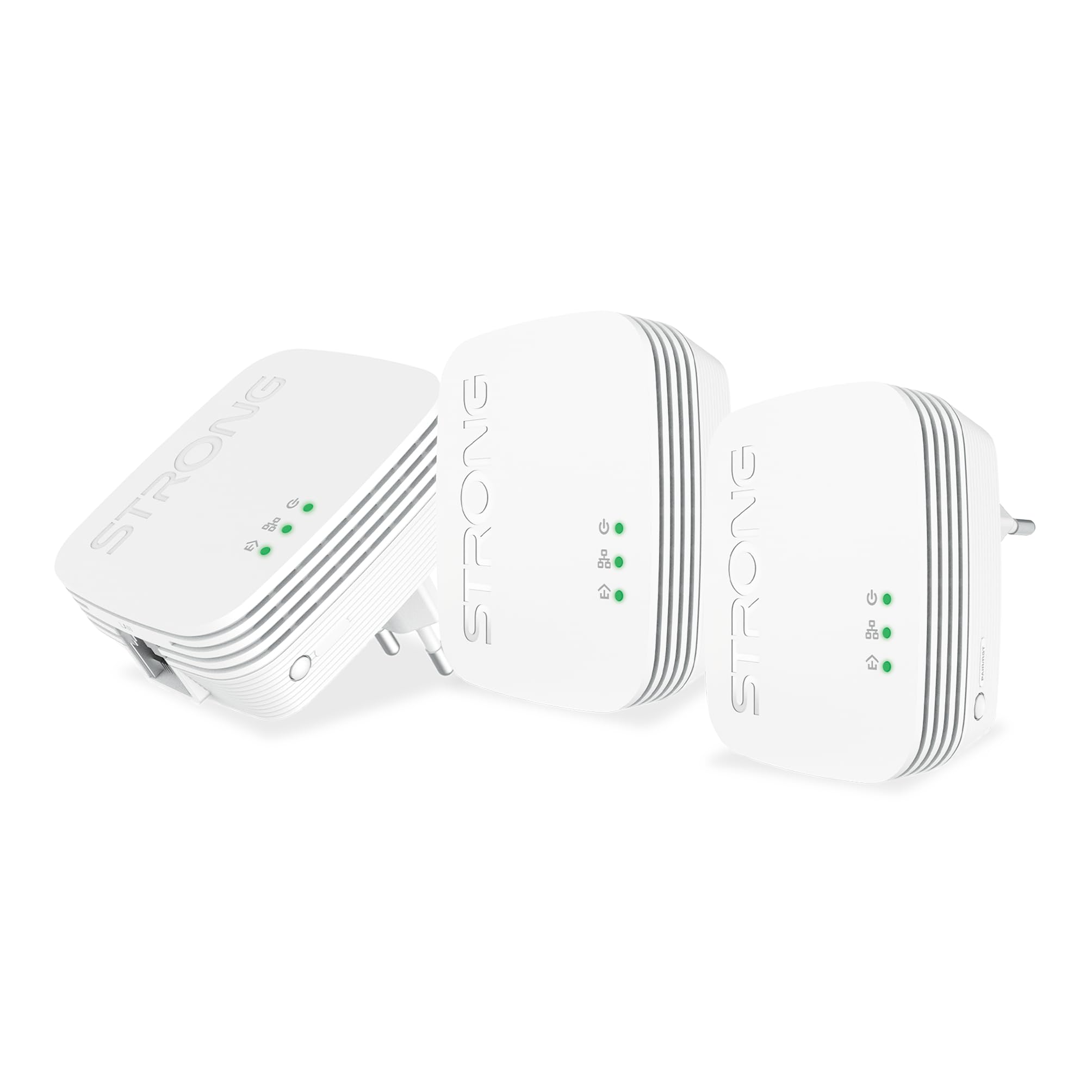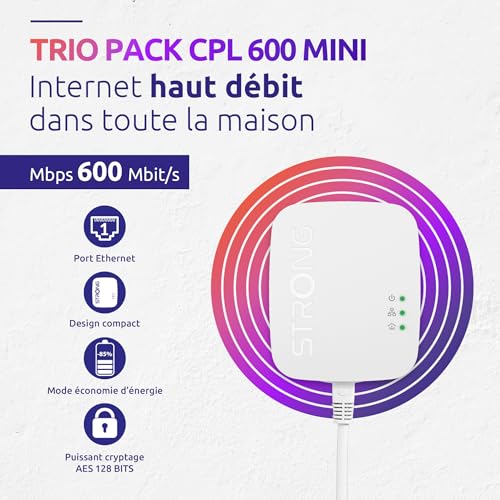 SE CONNECTER PARTOUT : Ce trio constitué d’un émetteur et deux récepteurs CPL permet d’avoir internet sans box à proximité, dans n’importe quelle pièce de votre logement, à partir du moment où une box est présente dans une autre zone de l’habitation. HAUT DÉBIT : Offrant un débit allant jusqu’à 600 Mbp/sec, ce kit CPL permet de diffuser internet par l’intermédiaire des prises de courant jusqu’à 300 mètres de distance de la box ou du routeur équipant le logement. AVEC PRISE ETHERNET : Chaque boîtier CPL est équipé d’une prise RJ45 pour la connexion à la box et pour relier directement votre PC, télévision, console de jeux ou autre équipement pour profiter de fonctionnalités réseaux fiables et rapides. SÉCURISÉ, PRATIQUE ET ÉCONOMIQUE : Ce kit CPL offre une sécurité optimale grâce à son cryptage AES 128 bits. Plug & Play, il s’installe en une minute sans configuration et possède un mode économie d’énergie réduisant la consommation jusqu’à 85 %. DES SOLUTIONS ÉLECTRONIQUES SIMPLES ET PERFORMANTES : Depuis 1986, la marque Strong offre une gamme complète de produits électroniques haut de gamme alliant performance, simplicité et fiabilité pour une connectivité et une expérience optimales.