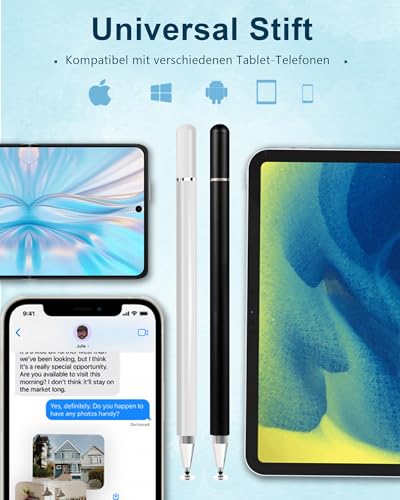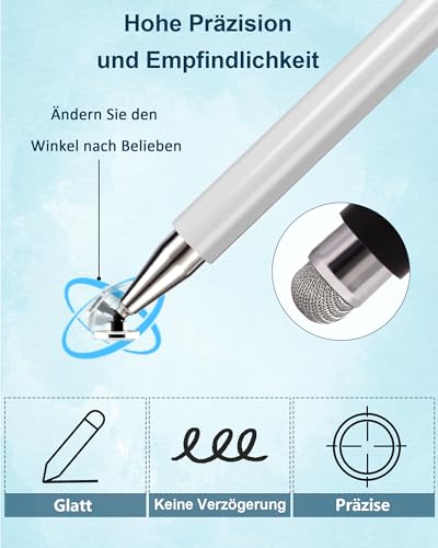 Stylet pour écran tactile : Ce stylet est compatible avec tous les écrans tactiles capacitifs, tels que les tablettes, les téléphones portables, etc. Il libère vos doigts et offre une meilleure sensibilité et réactivité à l’écran, pour une expérience d’écriture authentique. Large gamme d’appareils compatibles : Ce stylet fonctionne sur tous les écrans tactiles et est compatible avec les Samsung Galaxy, les appareils Android, les tablettes, les ordinateurs tactiles, les Kindle, les Chromebook et autres appareils dotés d’un écran tactile capacitif. Conception 2 en 1 : Une extrémité du stylet est dotée d’une pointe en forme de disque transparent, idéale pour l’écriture manuscrite et les dessins détaillés. Le disque transparent ne gêne pas la vue. L’autre extrémité est dotée d’une pointe en fibre résistante, idéale pour la navigation sur le Web ou la lecture. Facile et pratique à utiliser : Ce stylet ne nécessite pas de piles et ne nécessite pas de connexion Bluetooth ni d’application. Son design en forme de disque et de pointe en fibre simule les doigts humains, ce qui le rend plus facile à utiliser. Capuchon de protection magnétique : Le capuchon du stylo est doté d’un système de réglage magnétique bidirectionnel pour un ajustement optimal. Le disque de sauvegarde est situé à l’intérieur de la pointe de la fibre. Dévissez la tête en fibre pour vider le disque.