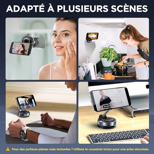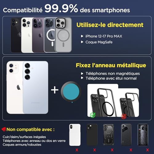 ✨ Support de Téléphone Portable Ultra-portable et ajustable Le support magnétique MSXTTLY offre une flexibilité incroyable grâce à sa barre métallique à double axe innovante : 210° en mode portrait et 360° en mode paysage. Compact et léger (seulement 2,5″ x 2,5″ x 1,5″ pour 0,2 lbs), il est l’accessoire idéal pour transporter ton téléphone partout ! 🚗 Suction puissante & stabilité maximale – Pour une conduite sans souci Fini les supports instables ! Grâce à sa succion rotative, il reste solidement en place même sur des routes accidentées ou lors de freinages brusques. Supporte jusqu’à 80 lbs et testé dans des conditions extrêmes (-40°F à 300°F). Une sécurité totale pour chaque trajet ! 🛣️ 🧲 Aimant ultra-puissant – Ne laisse jamais tomber ton téléphone ! Ce support magnétique est équipé d’un aimant N52, offrant une force magnétique de 2400 GF, testé pour des conditions extrêmes. Il maintient ton téléphone en place même sur des terrains accidentés ou lors de virages serrés. Le support idéal pour les conducteurs exigeants ! 🌟 Polyvalent – Utilisation facile partout ! Pas seulement pour la voiture ! Utilise ce support dans ton bureau, ta cuisine, ta salle de sport et partout où tu en as besoin. Compact, portable et prêt à l’emploi – un allié parfait pour chaque situation ! 📱 Compatibilité totale – Pour tous les smartphones Compatible avec les iPhone 16/15/14/13/12 et tous les appareils MagSafe. Inclut un anneau magnétique pour les téléphones non MagSafe. Une fixation magnétique fiable pour tous tes appareils !