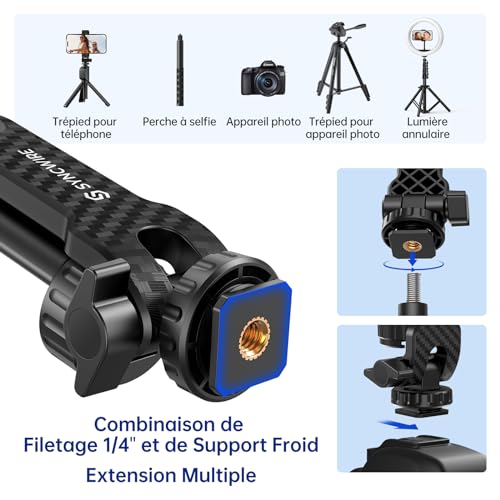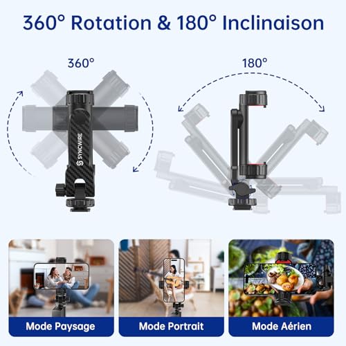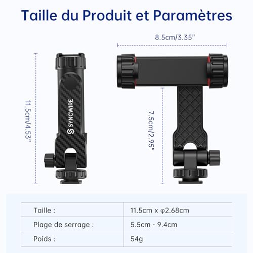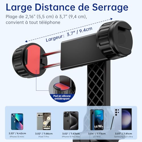 [Supports à Chaussures Froides Doubles] Fixez des microphones, des éclairages et des accessoires pour améliorer vos prises de vue ou vlogs. [Design à vis Polyvalente] Le trou de vis 1/4″ est compatible avec des trépieds, des perches à selfie, des caméras et divers accessoires. [Rotation à 360°, Inclinaison à 180°] Passez facilement du mode paysage au mode portrait grâce à un angle réglable offrant un contrôle précis. [Compatibilité Universelle pour Téléphones] Compatible avec les smartphones allant de l’iPhone 14 au Galaxy S23 Ultra, et prenant en charge des appareils d’une largeur de 2,16″ à 3,7″. [Prise Sécurisée] Le coussinet en silicone épais et antidérapant assure une stabilité même avec une coque de téléphone épaisse.