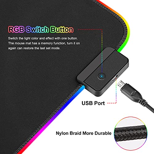 🖱️【Couverture Complète de Grande Taille】Taille du tapis de souris Peakness RBG À 800 x 300 x 4 mm, tout type de clavier ou de souris peut être placé. Le tapis de souris RGB est conçu avec une surface micro-texturée dure et précise pour optimiser la réponse de la souris et fournir un mouvement plus rapide dans les jeux. 🖱️【Éclairage RGB】14 couleurs + le mode de changement peut être commuté en un clic. Appuyez deux fois sur le commutateur pour modifier la luminosité de la lumière RGB. Il y a 2 réglages de luminosité disponibles. Appuyez sur le bouton et maintenez-le enfoncé pendant 3 secondes pour désactiver l’effet d’éclairage RGB. 🖱️【Base en Caoutchouc Imperméable Antidérapante】Tapis de souris de jeu de grande taille avec base en caoutchouc antidérapante, la base en caoutchouc antidérapante peut être utilisée sur n’importe quelle surface, assurant un contrôle et des performances précis de la souris. Le revêtement hydrofuge empêche les dommages accidentels causés par les déversements de liquide. 🖱️【Pratique et Facile à Utiliser】Ce tapis de souris de jeu LED est alimenté par USB et ne nécessite aucun pilote. Équipé d’un câble de 1,2 m. Opération à une touche – plug and play. 🖱️ 【Grand Cadeau】Si vous cherchez un cadeau spécial pour les employés de bureau, les joueurs passionnés, les étudiants, nos tapis de souris de jeu sont le meilleur choix pour vous. Qu’il s’agisse d’un anniversaire ou d’une fête spéciale, un tapis de souris de jeu est un cadeau idéal.