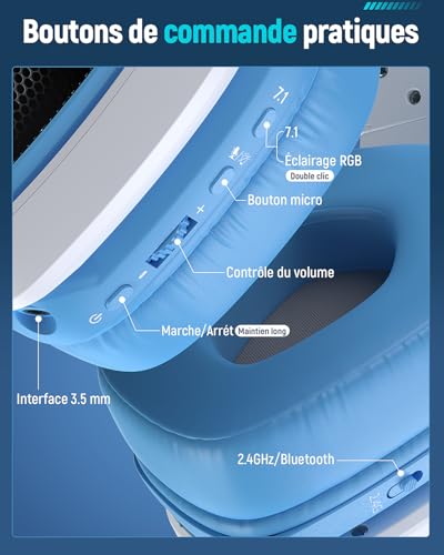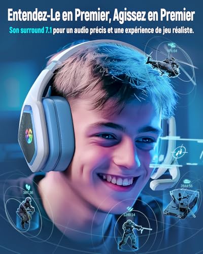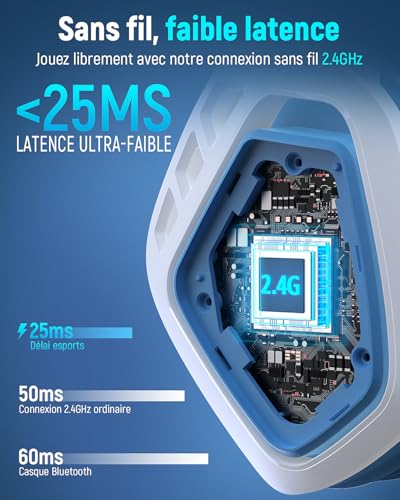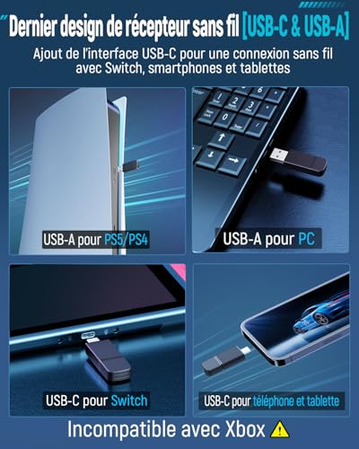 🎧【Dernière version 2024 avec connexion sans fil “USB-A/USB-C”】Le casque gaming sans fil Tatybo est équipé de la technologie de transmetteur sans fil la plus récente. Avec l’ajout d’un port USB-C, il peut se connecter à la Switch et aux smartphones. Le port USB-A est également inclus, compatible avec Windows, PS4, PS5 et les ordinateurs portables, élargissant ainsi les possibilités de connexion des casques gaming sans fil. 🎧【Une expérience de jeu fluide】Le casque gaming sans fil Tatybo WT5 intègre une technologie innovante qui réduit la latence à moins de 25 ms. Grâce à la fonction plug-and-play, il garantit une connexion stable quasi instantanée et sans décalage. 🎧【Coussinets d’oreille épais et isolants】Les coussinets du casque gaming WT05 sont fabriqués en cuir synthétique de haute qualité. Le revêtement doux protège les oreilles tout en bloquant les bruits extérieurs grâce à des coussinets de 3 cm d’épaisseur, vous permettant de plonger dans vos jeux sans distraction. 🎧【Microphone à réduction de bruit ENC】Équipé d’une puce d’annulation du bruit environnemental, le microphone offre une transmission vocale claire, même dans un environnement bruyant, pour une communication réaliste comme si vous étiez en face de votre interlocuteur. 🎧【Autonomie de 40 heures】Ce casque audio est doté d’effets lumineux RGB stylés, vous permettant de vous démarquer parmi les joueurs. Avec l’éclairage RGB désactivé, l’autonomie atteint 40 heures, et avec l’éclairage activé, elle atteint 30 heures. 🎧【Compatibilité du casque sans fil】 ① Dongle USB-A : PC, Ps4, Ps5, ordinateurs portables ② Dongle USB-C : Switch, tablettes, smartphones ③ Mode filaire avec prise jack 3,5 mm : Compatible avec tous les appareils équipés d’une prise jack 3,5 mm ⭐ Remarque 1 : Le casque sans fil n’est pas compatible avec les consoles Xbox. ⭐ Remarque 2 : En mode filaire, le casque s’éteint automatiquement et démarre en mode filaire.