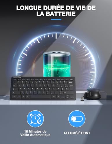 【Connexion sans fil stable 2,4 GHz】 La technologie sans fil 2,4 G assure une connexion stable et puissante jusqu’à 15 mètres, réduisant ainsi l’encombrement des câbles sur votre bureau. La souris et le clavier partagent 1 dongle USB, pas besoin d’occuper plusieurs ports USB. (Le récepteur USB est situé en bas de la souris) 【Structure Compacte, Facile à Transporter】Clavier souris sans fil a une conception compacte sans pavé numérique et n’occupe que les deux tiers de l’espace, peu encombrant et facile à transporter, parfait pour une utilisation à la maison, au bureau ou en voyage.Petit clavier sans fil (290*125*21mm, 296g) et souris (110*65*30mm, 58g) 【12 Touches de Raccourci Efficaces】 Le clavier sans fil présente une conception de touches en ciseaux qui s’aligne parfaitement avec le bout de vos doigts, offrant une expérience de frappe confortable et silencieuse.Ce ensembles clavier et souris dispose de 12 touches de raccourci multimédia pour un accès facile à la lecture de musique, à la navigation Web, à la messagerie électronique et bien plus encore pour une commodité et une efficacité accrues. 【Clic Super Silencieux】Clavier souris sans fil azerty est conçue pour un fonctionnement silencieu.les clics gauche et droit sont très silencieux, garantissant que vous ne dérangerez pas les autres autour de vous. La souris réglable DPI offre 3 niveaux de DPI (800/1200/1600) pour répondre à vos différents besoins en termes de sensibilité.Les touches de la souris et du clavier sont durables et peuvent résister à plus de 8 millions de pressions pour une fiabilité à long terme. 【Large Compatibilité】Ensemble clavier souris sans fil compatible avec Windows 11/10/8/7/2000/XP, fonctionne avec les ordinateursc portables, les ordinateurs de bureau et les Chrome Books. Le clavier azerty sans fil nécessitent chacun 2 piles AAA (piles non incluses) 【Assistance 36 MOIS】Si vous rencontrez des problèmes lors de l’utilisation de souris clavier ordinateur sans fil TECKNET, veuillez contacter l’équipe du service client professionnel TECKNET et profitez de l’assistance TECKNET de 36 mois (Enregistrée Uniquement).