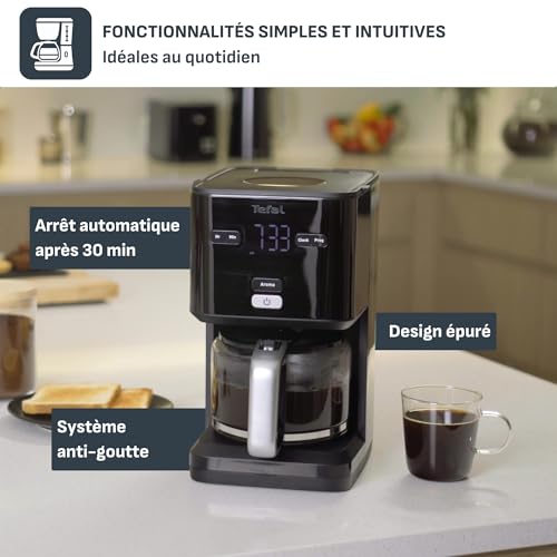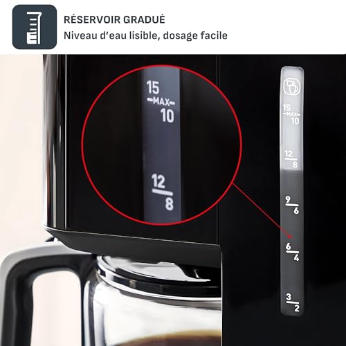 CAFETIÈRE FILTRE GRANDE CAPACITÉ 1,25 L : Prépare jusqu’à 10-15 tasses, idéale pour partager votre café chaud en famille ou entre amis. INTERFACE DIGITAL : Ecran numérique minimaliste intégré qui permet une lecture facile de l’heure et des fonctions. DÉPART DIFFÉRÉ PROGRAMMABLE JUSQU’À 24H : Votre café prêt quand vous l’êtes, à savourez dès le réveil, ou plus tard, selon vos envies. INTENSITÉ RÉGLABLE : Fonction AROMA avec pré-infusion pour personnaliser la force de votre café selon vos envies. ARRÊT AUTOMATIQUE APRÈS 30 MIN : Pour plus de sécurité et d’économies d’énergie. RÉPARABILITÉ 15 ANS AU JUSTE PRIX : Produit réparable dans notre réseau de 6200 réparateurs dans le monde pour prolonger sa durée de vie.