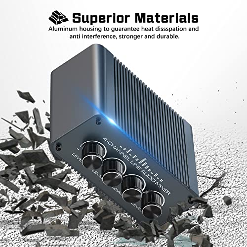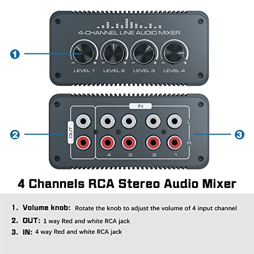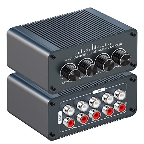 Mini mélangeur audio stéréo : ce mini mixeur audio peut mélanger rapidement et facilement 4 signaux audio stéréo dans un instrument de mixage, de sorte que vous pouvez étendre, contrôler et mélanger les signaux stéréo. 4 canaux : la table de mixage stéréo dispose de 4 entrées RCA stéréo et d’une sortie RCA stéréo, chaque canal a un contrôle du volume indépendant, ce qui vous permet d’ajuster facilement le volume en fonction de vos besoins. Transmission stable et silencieuse : ce mixeur audio stéréo n’affecte pas la qualité sonore de la source audio. Le bruit extrêmement faible assure une excellente performance audio même à un niveau de sortie maximal. Facile à utiliser : Plug and Play, aucune alimentation supplémentaire nécessaire. Ce mini mitigeur passif dispose d’un boîtier en aluminium robuste et durable. Et grâce à sa taille compacte, il est facile à transporter. Large application : ce mélangeur stéréo passif peut être utilisé de manière flexible sur les lecteurs de cassettes, lecteurs CD, enregistreurs de cassettes, ordinateurs, téléphones portables, tablettes, etc. Convient pour les spectacles et les productions de musique.