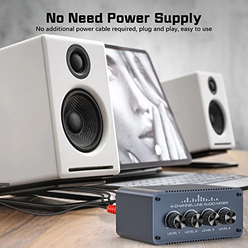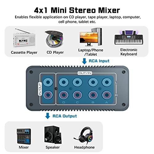 Tendak Mini mixeur audio stéréo passif 4 canaux RCA Mini stéréo 4 en 1 sortie RCA L/R avec commandes de volume séparées pour instrument de mixage, ordinateur, lecteur CD