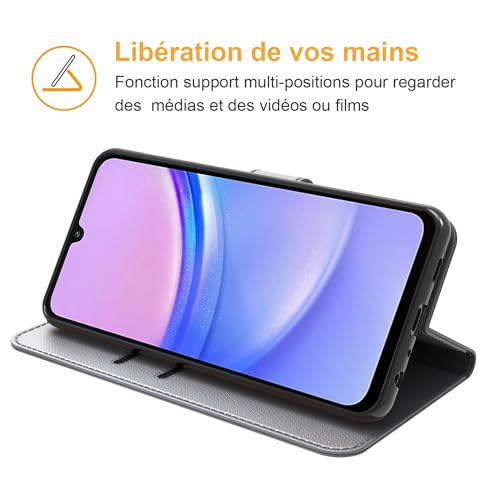 ✅[Compatiblité] Compatible uniquement avec Samsung A15 4G / 5G ,Veuillez bien verifier le model de Votre téléphone avant de acheter. ✅[Qualité] Cette housse portefeuille en Simili cuir PU est frabriquée avec doublure microfibre,pratique et élégant,elle protège votre smartphone dans tous les sens,anti chocs et chutes. ✅[Multifonction] Cette housse possède Plusieurs emplacements pour les cartes bancaires (ticket métro,bus,d’autres carte). ✅[Fonction Stand]Cette housse peut libérer vos mains avec la mode sand vidéo,soutenir votre phone en position horizontale,idéal pour regarder des vidéos et surfer sur internet. ✅[Acces Libre]La fermeture avec rabat magnétique assure la sécurité de vos cartes et billets,et aussi protége mieux lorsque une chute.elle permet d’utiliser tous les boutons,les ports,les capteurs et objectifs de caméra,mais n’affecte pas la protection du téléphone.