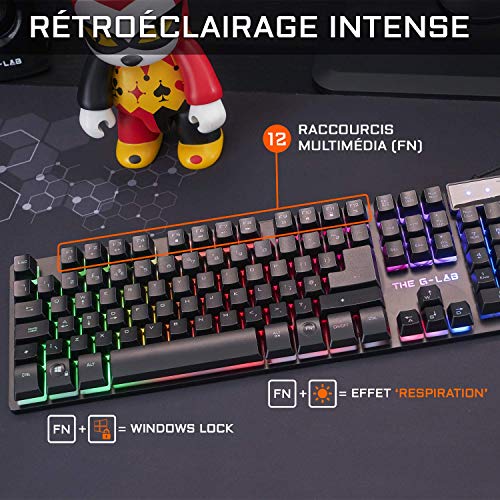 FRAPPE PARFAITE. Le clavier gamer du Combo Krypton vous garantit une frappe réactive, précise et silencieuse en toutes circonstances. Vous serez plus rapide que jamais peu importe le jeu ! Profitez de l’anti-ghosting 6 touches afin d’éviter les conflits et actions non désirées. Le clavier propose aussi 12 touches raccourcis multimédias pour les fonctionnalités de base de votre PC. Le mode gaming vous permet de bloquer la touche Windows en jeu pour éviter les retours bureau accidentels. RÉACTIVITÉ EXCEPTIONNELLE. Le Combo Krypton propose également une souris gamer avec 6 boutons. Son capteur optique ultra précis vous permet d’ajuster la sensibilité jusqu’à 3200 DPI selon 4 paliers. Dotée d’un taux de rafraîchissement de 250 Hz, cette souris vous assure une réactivité sans faille dans tous les jeux. Avec 8G d’accélération maximale, cette souris vous garantit de parfaitement retranscrire tous vos mouvements les plus rapides. La souris se branche en USB sans driver à installer. RÉTRO-ÉCLAIRAGE RESPLENDISSANT. Illuminez votre bureau grâce au combo Krypton et son rétro-éclairage ultra lumineux. De jour comme de nuit, vous apprécierez l’éclairage fixe multicolore du clavier. Il est possible de modifier la luminosité des LED ou de désactiver les lumières si vous le souhaitez. L’effet “Breathing” donne la sensation que le clavier respire en couleurs ! La souris propose elle un rétroéclairage RGB circulaire intense et dynamique pour animer votre set up gaming. DESIGN ERGONOMIQUE + ROBUSTE. L’ergonomie et la durabilité du Combo Krypton ont été particulièrement travaillés lors de sa conception. Le clavier est très résistant et stable grâce à sa structure en acier renforcé. Il pèse 830g et ne bougera pas d’un centimètre pendant que vous jouez. La souris vous assure une prise en main parfaite et confortable peu importe la taille de vos mains. Elle est ultra légère et ne pèse que 110g. Les câbles sont tressés et particulièrement résistants à l’usure. DURABLE + GARANTIE 2 ANS. Chez The G-LAB, nous prenons à cœur de tester tous nos produits afin de vous assurer la meilleure qualité possible. Si jamais le combo Krypton ne vous convient pas, Destockage Multimédia vous permet de le retourner sous 30 jours, sans frais et d’obtenir un remboursement intégral. Ce modèle est garanti 2 ans, c’est un investissement sans risque pour vous. Très attentif à l’avis de nos clients, notre SAV français sera toujours là pour vous aider si nécessaire et répond en -24h.