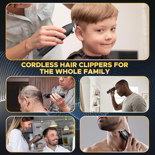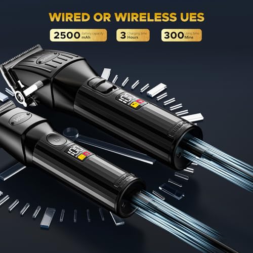 Kit professionnel de coupe et de tondeuse à cheveux : notre kit de coupe de cheveux professionnel comprend une tondeuse à cheveux sans fil ultramoderne avec 6 peignes de guidage (1,5 mm, 3 mm, 4,5 mm, 6 mm, 10 mm, 13 mm) et une tondeuse de détail avec 4 peignes de guidage (1 mm, 2 mm, 3 mm, 4 mm). Il répond aux exigences en matière de coupe de cheveux, d’art capillaire, de rasage et de soins du corps. Le kit convient aussi bien pour les coiffeurs professionnels que pour un usage domestique. Écran LCD intelligent et batterie de grande capacité : La tondeuse à cheveux professionnelle dispose d’une batterie rechargeable intégrée de 2 500 mAh de haute qualité qui offre une autonomie extra longue de 300 minutes après une charge complète de 3 heures. La tondeuse de détail peut fonctionner pendant 180 minutes après une charge complète de 2 heures avec une seule charge. Les deux tailles de tondeuse à cheveux sont dotées d’un écran LCD haute résolution indiquant le niveau de charge, ce qui vous permet de connaître le niveau de charge à tout moment et de refuser de l’éteindre. Moteur puissant et technologie silencieuse : La tondeuse à cheveux et la tondeuse sont toutes deux équipées de moteurs haute performance à noyau en cuivre, qui permettent à la tondeuse à cheveux de fonctionner plus rapidement et plus efficacement à 7 000 tr/min. La grande tondeuse à cheveux convient aux cheveux épais et mouillés sans tirer ni coller, et offre une expérience de coupe plus agréable. Les tondeuses à cheveux de toutes tailles sont équipées de la dernière technologie de réduction du bruit, de sorte que le niveau sonore de la tondeuse à cheveux est inférieur à 60 décibels lors du fonctionnement. Lame en T ultra-tranchante en titane : La tondeuse à cheveux dispose d’une lame en T à zéro écart. Le design étroit de la tondeuse de précision en acier facilite la tonte des cheveux, de la barbe, des favoris, des bords autour des oreilles et des poils du corps. La tête de la tondeuse peut couper à une longueur de 0,1 mm, une norme professionnelle pour le contour complet, le rasage à sec et le masquage. Kit de coupe de cheveux tout-en-un : Ce kit de coupe de cheveux tout-en-un comprend une tondeuse à cheveux sans fil, une tondeuse à barbe à lame en T, 6 peignes de fixation pour tondeuse à cheveux, 4 peignes de fixation pour tondeuse de détail, un peigne professionnel, de l’huile pour lame, 2 brosses de nettoyage, une cape de coiffeur, un câble USB et un lubrifiant de salon de 3 ml – Une coupe parfaite.