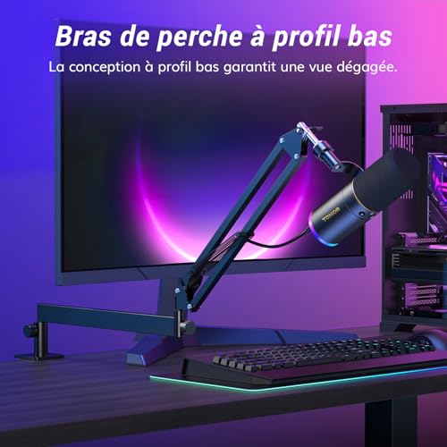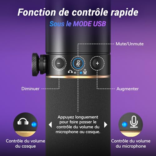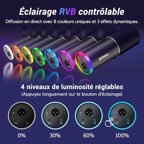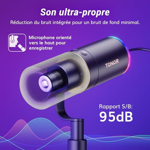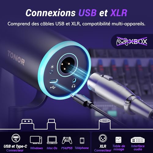 Éclairage RVB contrôlé : L’anneau lumineux du micro de gaming offre 4 modes et plus de 11 combinaisons de couleurs. Basculez facilement d’une couleur à l’autre à l’aide du bouton situé à l’arrière du microphone. Réglez la luminosité RVB de 0 % à 30 %, puis de 60 % à 100 % en appuyant longuement sur le bouton, même dans les pièces faiblement éclairées. Personnalisez le système d’éclairage parfait pour qu’il corresponde à l’ambiance de votre espace ! Qualité sonore irréprochable : ce micro USB possède un noyau dynamique de haute qualité pour une grande réponse en fréquence (60Hz-17kHz) et des niveaux de pression sonore impressionnants (jusqu’à 120dB). Il garantit l’absence de distorsion dans les enregistrements vocaux, vidéo ou musicaux, préservant ainsi leur authenticité. Microphone dynamique TONOR à directivité cardioïde et technologie antibruit intégrée pour une expérience sonore pure. Portée d’enregistrement recommandée : 5 à 10 cm. Sortie USB et XLR : Ce microphone dynamique prend en charge les sorties USB et XLR. Il est facile à utiliser sur un ordinateur de bureau ou portable grâce à la fonction “plug-and-play” en mode USB. L’interface XLR émet des signaux analogiques avec un bruit de fond réduit et un son plus net, améliore la qualité d’enregistrement pour un son de jeu immersif et prend en charge la connexion à une interface audio et à une table de mixage pour présenter un son plus naturel et haut de gamme. Surveillance sans latence : Ce micro XLR avec une prise casque de 3,5 mm peut améliorer votre expérience de gaming. Vous pouvez contrôler le niveau de volume en temps réel. Les boutons « + » et « – » situés sur le boîtier du microphone permettent aux utilisateurs de régler indépendamment le gain du microphone et le volume de l’entrée du casque (uniquement en mode USB, une interface audio est nécessaire pour le contrôle du volume en mode XLR). Coupez le son d’un seul clic sur le bouton MUTE. Bras métallique à profil bas : le bras du microphone de podcast peut s’étendre depuis le bas de l’écran de l’ordinateur, offrant une vue dégagée pendant son utilisation. Lorsque vous avez fini d’utiliser le microphone, le support peut être facilement rangé sous l’écran, ce qui permet d’économiser de l’espace. Plug & Play : Branchez simplement le câble et commencez à utiliser le microphone de streaming. Parfait pour les jeux, le podcasting ou les conférences. L’emballage comprend des connecteurs USB et de type C, ainsi que des connecteurs XLR. Les connecteurs USB et de type C le rendent compatible avec les ordinateurs, les PS5 et même les smartphones. La connexion XLR vous permet de vous connecter à une console de mixage et à une interface audio, permettant de gagner du temps lors de l’enregistrement.