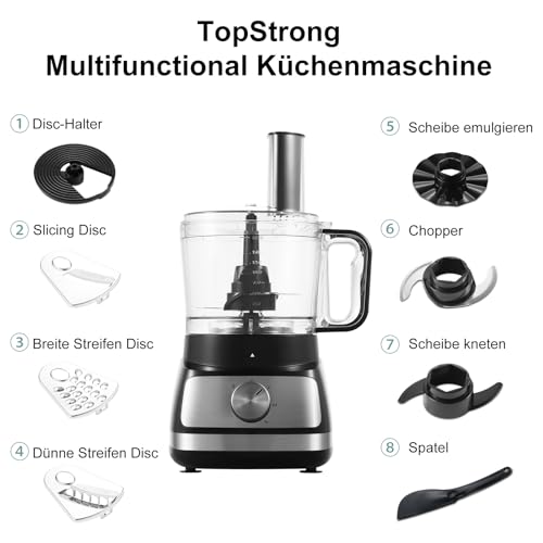 TopStrong Robot Multifonction, 6 en 1 Robot de Cuisine, 2L Robot Cuisine Multifonctions, Food Processor 800W, Robot Menager Multifonctions, Hachoir Mixeur