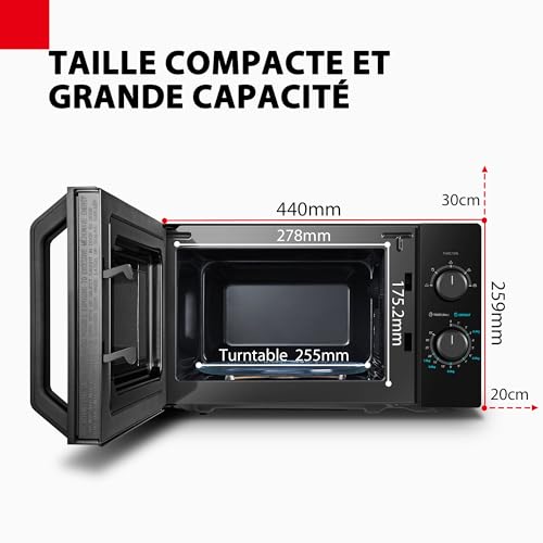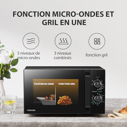 Cuisson Combinée : La cuisson combinée est spécialement conçue pour réchauffer vos plats tout en les grillant, offrant la chaleur et le croustillant de cuissons traditionnelles. 5 Niveaux de Puissance : Pour plus de possibilités et de flexibilité lors de vos cuissons. Vous pouvez aussi bien décongeler que maintenir vos plats au chaud ou faire bouillir de l’eau. 3 en 1 : Le Toshiba MW2-MG20P(BK) combine les fonctions grill, décongélation et réchauffage pour vous permettre des cuissons aussi efficaces que délicates Capacité de 20l : Sa grande cavité permet d’accueillir la plupart des plates du quotidien, tout en restant très compact pour s’adapter à toutes les cuisines. Spécificités: Puissance de gril de 1000 watts, puissance de micro-ondes de 800 watts avec 5 niveaux de puissance, dimensions externes (L x P x H): 440 x 334 x 259 mm, dimensions internes (L x P x H): 306 x 304 x 206, plateau tournant en verre de 255 mm.