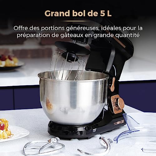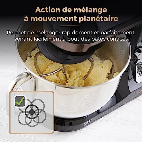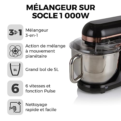 ROBOT MIXEUR 3-EN-1 : ce batteur électrique sur socle multifonction est livré avec un batteur plat, un fouet ballon et des crochets à pâte pour battre, fouetter ou pétrir sans effort vos ingrédients. ROBOT PÉTRIN AVEC ACTION DE MÉLANGE PLANÉTAIRE : notre robot de cuisine offre un mouvement de mélange planétaire ne laissant aucun ingrédient dans le bol, alimenté par un moteur haute performance pour un mélange rapide et complet. ROBOT DE CUISINE MULTIFONCTION AVEC GRAND BOL DE 5 L : Le grand bol mélangeur de ce pétrin professionnel est idéal pour la préparation de pâte à gâteau en grande quantité, vous permettant de réaliser des portions généreuses pour toute la famille ROBOT PÂTISSIER MULTIFONCTIONS AVEC 6 VITESSES ET MODE PULSE : ce pétrin à pain sur socle dispose d’une sélection de 6 réglages de vitesse avec une fonction Pulse pour obtenir facilement une consistance parfaite. NETTOYAGE RAPIDE ET FACILE : le bol et les accessoires de ce pétrin pizza passent au lave-vaisselle. Ce robot pâtissier professionnel sur socle est livré avec un couvercle verseur anti-projection pour éviter les éclaboussures de pâte lors du mélange.