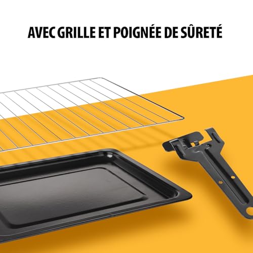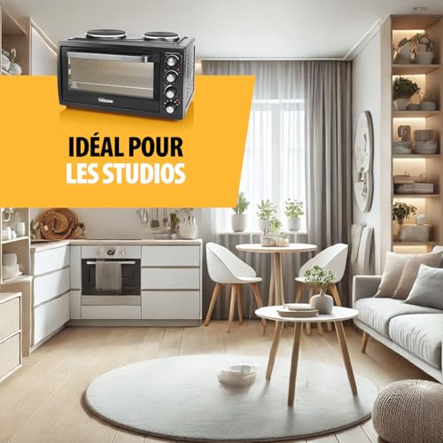 Options de Cuisson Polyvalentes : ce four à convection est équipé de deux plaques chauffantes indépendantes (1000 W et 600 W) sur le dessus, vous permettant de préparer plusieurs plats en même temps; Idéal pour maximiser l’espace dans votre cuisine, en particulier dans les petits foyers ou pour les étudiants Température et Chauffage Réglables : avec une large plage de température de 90 ⁰C à 230 C⁰, vous pouvez facilement faire cuire pizzas, pain croustillant et plus encore; Le four offre des options de chauffage supérieur et inférieur ajustables, avec ou sans convection, vous offrant ainsi une grande flexibilité de modes de cuisson Capacité de 38L avec Lumière Intérieure : ce four spacieux de 38 litres est parfait pour les petites familles, offrant suffisamment d’espace pour cuire et rôtir; La lumière intérieure vous permet de surveiller la cuisson sans ouvrir la porte Pratiques et Sûr : équipé d’une poignée résistante à la chaleur, de pieds antidérapants et d’un arrêt automatique, ce four privilégie la sécurité de l’utilisateur; La grille de cuisson et le plateau fournis peuvent être retirés en toute sécurité à l’aide de la poignée incluse Idéal pour les Petites Cuisines : Combinant four et plaques chauffantes, cet appareil permet de gagner de la place sur votre surface de travail, ce qui le rend parfait pour les cuisines avec un espace limité; Il est également adapté pour le camping, offrant une solution compacte et fonctionnelle