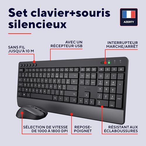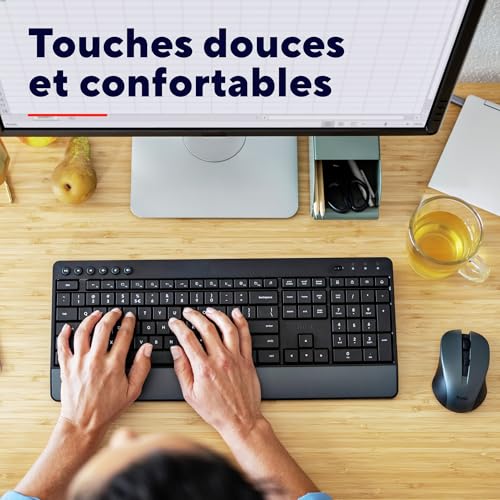 SILENCE DIGNE D’UNE BIBLIOTHÈQUE – Avec ses touches à sensation souple et ses boutons silencieux, l’ensemble de bureau Trezo est le plus silencieux jamais conçu PROTÉGEONS LA PLANÈTE – Avec 85 % de matériaux recyclés, sa conception plus durable respecte l’environnement TOUJOURS PRÊT – Découvrez une expérience de travail sans fil avec une grande autonomie de la batterie de 48 mois pour le clavier et 12 mois pour la souris PLUS QU’UNE TOUCHE DE CONFORT – Clavier avec repose-poignet, touches média, résistance aux éclaboussures et configuration AZERTY qui fera le bonheur de vos mains REJOIGNEZ LE MOUVEMENT – Souris silencieuse à DPI réglable (1 000-1 400-1 800) pour une sensibilité précise et conception ambidextre qui plaira aux gauchers comme aux droitiers
