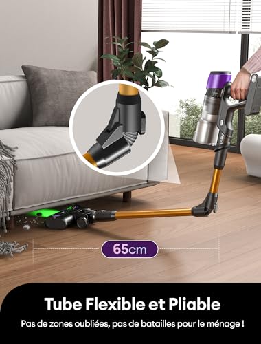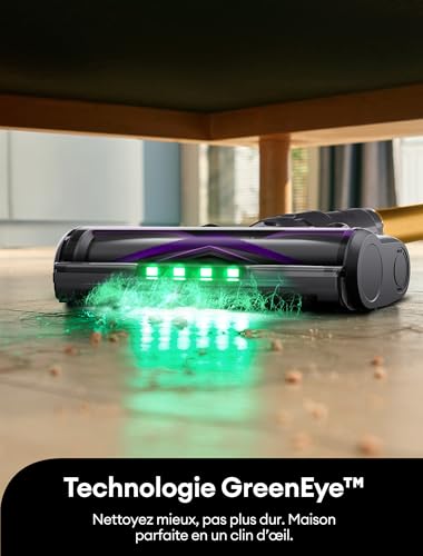 PUISSANCE SUPÉRIEURE : Équipé d’un moteur de 600 W et d’une aspiration de 55 kPa spécialement optimisée pour les foyers avec animaux, cet aspirateur élimine efficacement les poils, la poussière et les salissures, tout en garantissant un environnement domestique impeccable. 60 MIN D’AUTONOMIE ÉNERGÉTIQUE : La batterie lithium-ion à 8 cellules offre jusqu’à 60 minutes de nettoyage continu, couvrant jusqu’à 200 m². Grâce à 3 modes (Turbo / Moquette / Sol dur) et à un écran affichant le temps restant, la puissance s’adapte intelligemment à l’énergie disponible, vous offrant un contrôle total de votre session de nettoyage. BROSSE ANTI-ENCHEVÊTREMENT : Notre technologie innovante élimine les poils jusqu’à 45 mm de long (contre 30 mm pour les aspirateurs classiques). Fini le besoin d’interrompre le nettoyage pour démêler les poils, vous profitez ainsi d’une expérience fluide à chaque utilisation. CONDUITE FLEXIBLE ET DESIGN AUTO-STABLE : Le tube articulé permet d’atteindre les recoins sous les meubles, tandis que la brosse se tient debout seule, sans support mural ni fixation. Posez-le instantanément pour répondre au téléphone ou vider la poubelle, avec une stabilité garantie en toutes circonstances. TECHNOLOGIE GREENEye : Un éclairage vert de 350 mm³ révèle les salissures invisibles sur les sols durs, avec une portée de 1,2 mètre. Une visibilité accrue pour un nettoyage de précision, capturant les moindres particules. FILTRATION 7N ET SILENCE OPTIMAL : Un système de filtration à sept couches capture poils, allergènes et acariens tout en purifiant l’air pendant les périodes de mue. Avec une réduction du bruit à 60 dB, il allie puissance discrète et efficacité maximale, offrant ainsi un confort sans sacrifier la propreté. SAV SANS SOUCI – Achetez en toute confiance avec le support Ultenic disponible 24/7, une garantie de 2 ans sans souci, et des centres de services locaux en Europe pour des retours et réparations sans tracas