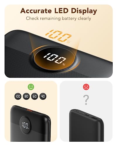 Compact et portable | Dimension:10,6*6,8*1,5cm,Poids:165g.Léger et portable, il peut être facilement mis dans la poche ou le sac à main femmes. Un power bank idéal pour l’utilisation quotidienne. Capacité de 10000mAh | Cette batterie externe 10000mAh permet d’alimenter iPhone 8 environ 3 fois, iPhone 8 plus environ 2.7 fois, iPhone X environ 2.7 fois, Samsung Galaxy S9 presque 2 fois, elle est compatible aussi avec tous les téléphones. Chargement bidirectionnel USB C | Avec la technique avancée, le port Type C bidirectionnel permet de charger les telephones ou de se recharger la batterie elle-même. Affichage numérique LED | L’écran numérique LED intégré a un affichage précis de 0 -100 qui peut refléter directement le changement de niveau en temps réel de la batterie, afin de recharger la batterie à temps. Vous obtiendrez | Ce que vous recevrez: Batterie externe 10000mAh, câble USB A vers USB Micro, sac de rangement, notice en multiples langues.