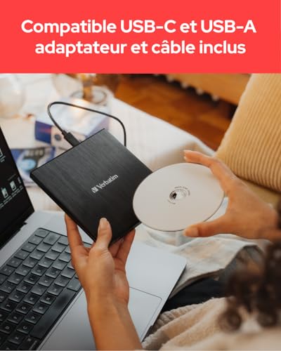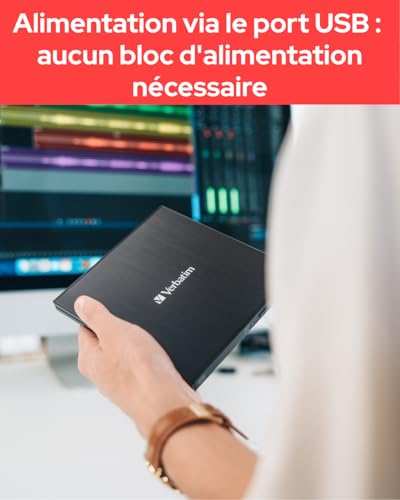MOYEN DE STOCKAGE IDÉAL – Le complément parfait pour connecter les notebooks, ultrabooks et netbooks sans lecteur. L’alimentation est assurée par le port USB, inutile d’utiliser un adaptateur encombrant. COMPATIBILITÉ POLYVALENTE – La compatibilité absolue avec tous les formats de disques courants, tels que le DVD, le CD ou la technologie d’archivage MDisc, vous permet de stocker tous les fichiers. FACILE À UTILISER – Il suffit d’insérer le disque que vous voulez dans le graveur et d’utiliser le logiciel inclus pour organiser, graver et archiver vos fichiers importants. IDÉAL EN DÉPLACEMENT – Compact et léger, le Rewriter est à peine plus grand qu’un DVD et se glisse dans n’importe quelle poche grâce à son boîtier ultra-mince. Emportez-le partout où vous allez. VERBATIM – Nos atouts dans la R&D, associée à un contrôle qualité rigoureux, garantit des produits et une technologie haut de gamme auxquels vous pouvez faire confiance. Remarque : Le paramètre d’économie d’énergie de Windows 10/11 doit être désactivé.