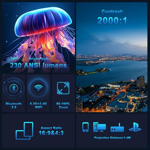 230 ANSI Lumens & Projection 4K Ultra HD:Le videoprojecteur 4K utilise un moteur optique amélioré avec une luminosité de 230 ANSI lumens, prenant en charge la résolution 4K et le décodage Full HD 4K. L’image reste nette et vibrante même en plein jour, offrant des détails précis et des couleurs cinématographiques WiFi 6 & Bluetooth 5,4: Profitez d’un streaming ultra-rapide avec le WiFi 6 (connexion en 0,5 secondes chrono !) et d’une connectivité Bluetooth 5.4 double canal pour un couplage instantané avec enceintes ou casques sans fil. Notre technologie de refroidissement exclusive réduit le bruit de fonctionnement de 50% par rapport aux projecteurs standard, tout en optimisant la qualité audio pour une expérience cinéma immersive Android 11.0 Smart OS: Ce vidéoprojecteur est équipé du système d’exploitation intelligent Android 11.0. Vous pouvez télécharger vos applications de streaming préférées pour regarder des vidéos et des films, rendant le divertissement accessible en un instant Auto Keystone Vertical: Video projecteur wifi bluetooth dispose d’une correction trapézoïdale auto qui peut s’ajuster automatiquement de haut en bas pour les décalages d’image causés par l’angle de projection. Un capteur intégré détecte les mouvements en temps réel et ajuste automatiquement l’image pour une mise au point rapide et précise. Vous pouvez régler la projection à l’aide de la télécommande fournie et profiter d’une soirée cinéma sur l’écran de votre chambre/loft/tente Mini Taille, Poids Lége: Pour IOS, Airpin (Pro) peut être utilisé. Pour Android, vous pouvez utiliser Miracast pour projeter. Assurez-vous que votre téléphone et votre projecteur sont connectés au même Wi-Fi lors de la projection de l’écran. Compact et léger, ce vidéoprojecteur est facile à transporter. Que vous soyez chez vous ou en voyage, il vous offre une expérience de cinéma portable