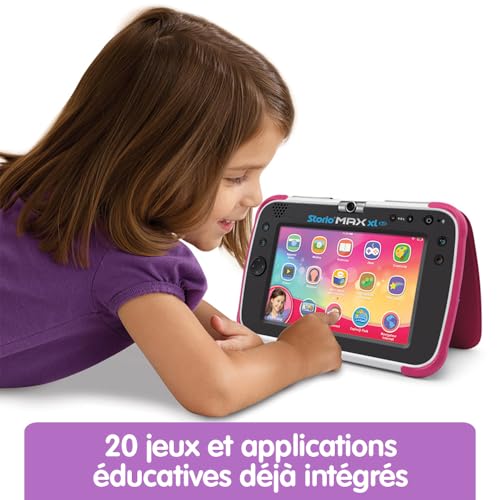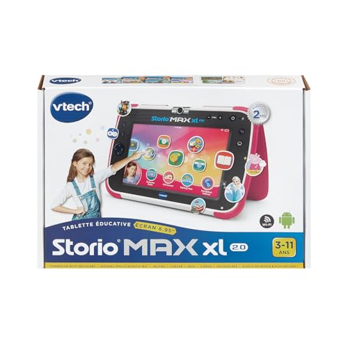 VERSION : Française ÂGE : de 3 à 11 ans, la tablette avec grand écran couleur 100% éducative et résistante CARACTÉRISTIQUES : Tablette enfant 100% éducative / Écran 6,95 pouces multi touch HD / Fonctionne avec WI-FI / Appareil photo rotatif 2 Mpx intégré / Mémoire interne de 8Go extensible jusqu’à 40Go via une carte micro SD (non fournie) / Lecteur de musique (prise casque ou haut-parleur) KID CONNECT : Application de messagerie pour échanger des messages écrits et oraux, des photos, et des dessins avec ses proches, via la tablette enfant et l’application sur un smartphone Android ou Apple. Nécessite l’installation de l’application Kid Connect sur le smartphone des adultes et l’utilisation du WI-FI pour la tablette Storio Max XL 2.0 CONTRÔLES PARENTAUX : Navigateur internet sécurisé / Accès Internet et Wi-FI faciles à désactiver sur le tablette enfant / Limitation du temps de jeu (durée et horaires) / Contrôle des sites accessibles via une liste blanche / Définition des contenus accessibles pour chacun des profils enfant