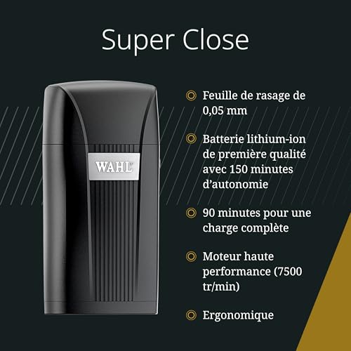 Rasage précis de très près : Le rasoir Super Close assure un rasage précis et ultra-rapproché pour une finition lisse et nette. Parfait pour nettoyer les lignes des cheveux et du cou et éliminer les poils errants Performances élevées : Équipé d’un moteur puissant, ce rasoir offre une coupe efficace pour un rasage rapide et efficace Conception confortable et ergonomique : Conçu dans un souci de confort, le rasoir Super Close est léger et offre une prise en main confortable et une manipulation aisée Batterie longue durée : La batterie fiable et durable garantit 150 minutes d’utilisation ininterrompue avec seulement 90 minutes nécessaires pour une charge complète. Il peut également être utilisé avec fil si vous le souhaitez Wahl : Depuis plus de 100 ans, Wahl fabrique des produits de toilettage qui allient savoir-faire, innovation et fiabilité. En s’engageant à satisfaire ses clients, Wahl continue d’être un choix de confiance pour les particuliers et les entreprises