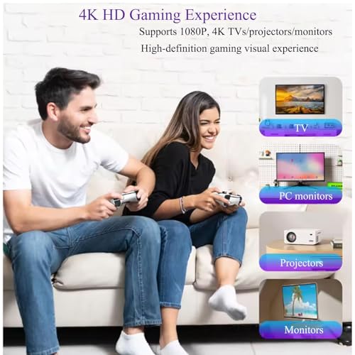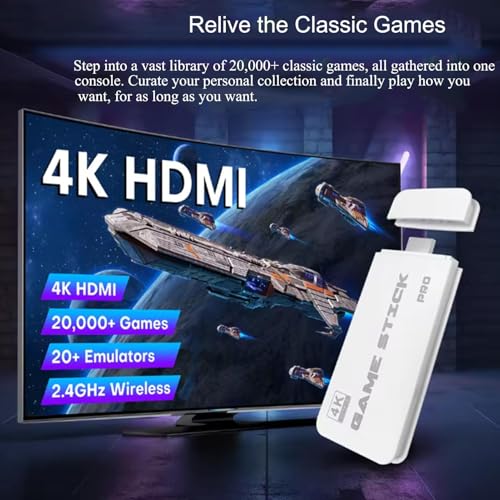 Vaste bibliothèque de jeux rétro pour console: Le système de jeu TV classique sans fil M15 dispose de plus de 20 000 jeux intégrés et de 23 émulateurs préinstallés, vous permettant de jouer à tous vos classiques préférés sans avoir à les télécharger ou à vous connecter à Internet. La console rétro est le meilleur choix pour les réunions de famille, les réunions entre amis et les fêtes d’anniversaire, pour profiter du jeu sur le canapé avec votre famille ou vos amis. Console de jeux vidéo HDMI 4K: la console rétro prend en charge une extension TF de 64 Go. Prend en charge la sortie HDMI 4K HD, la qualité HD 1080P, équipée d’un câble HDMI prolongé pour différents moniteurs, peut être connectée à un téléviseur/ordinateur/décodeur TV/PC. Veuillez vous assurer que votre écran dispose d’une entrée HDMI afin que la console puisse être connectée à votre téléviseur/décodeur TV. 2 manettes sans fil: les manettes sans fil 2,4 GHz prennent en charge 2 joueurs. La manette de jeu sans fil 2,4 GHz est livrée avec une console de jeux vidéo rétro et 23 émulateurs pour la connexion sans fil entre la manette de jeu et le joystick. Vous pouvez jouer à vos jeux préférés confortablement depuis votre canapé, sans aucun câble. (Les piles AAA ne sont pas incluses.) Prise en charge multilingue: la manette de jeu rétro sans fil est équipée de 26 langues de différents pays ou régions, ce qui permet aux joueurs de rechercher des jeux, de personnaliser leurs jeux préférés ou de jouer et de télécharger leurs propres jeux pour une meilleure expérience de jeu. Le cadeau idéal pour tous les âges: les jeux vidéo portables sont légers et compacts. Ils ne prennent pas beaucoup de place, sont faciles à transporter et conviennent aux voyages et à l’utilisation à domicile. La console M15 game stick 4k offre non seulement des heures de plaisir aux enfants, mais réveille également de beaux souvenirs d’enfance chez les adultes. C’est le cadeau idéal pour les anniversaires, Thanksgiving, Noël et les fêtes.