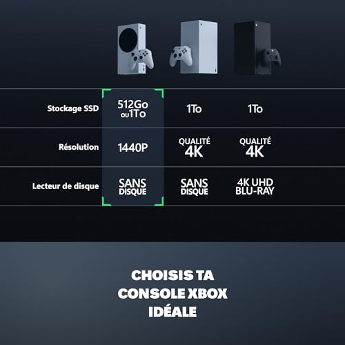 Lance-toi dans chaque mission, monde ouvert, match et plus encore à des vitesses allant jusqu’à 120 FPS avec le meilleur rapport qualité-prix dans le gaming. Passe facilement entre tes jeux préférés et reprend là où tu t’étais arrêté avec la fonctionnalité Quick Resume. Joue à quatre générations de jeux grâce à la rétrocompatibilité, dont des titres optimisés pour la Xbox Series X|S pour une expérience visuelle et de jeu meilleure que jamais. Lance instantanément tes jeux préférés avec des temps de chargement ultra-rapides. Tire le meilleur parti de ta Xbox Series S avec le Xbox Game Pass Ultimate (abonnement vendu séparément). Joue à de nouveaux jeux comme DOOM: The Dark Ages, The Outer Worlds 2, Hollow Knight: Silksong et plus encore dès leur sortie. Choisis parmi des centaines de jeux exceptionnels comme Indiana Jones and the Great Circle, Avowed, South of Midnight. Immerge-toi dans des franchises légendaires comme Call of Duty, Forza, Diablo, Halo et tant d’autres.* Avec Smart Delivery, il te suffit d’acheter une seule fois un jeu compatible pour avoir la meilleure version disponible pour la console sur laquelle tu joues. Les jeux que tu possèdes et qui font partie de Xbox Play Anywhere te permettent de commencer sur ta console puis de continuer là ou tu t’es arrêté sur ton PC ou sur tes appareils portables compatibles – ta progression, tes succès et tes extensions te suivent. Streame une sélection de jeux que tu possèdes ou que tu as achetés, même des jeux non inclus dans les Game Pass comme NBA 2K25, Hogwarts Legacy, Assassin’s Creed Shadows, et bien d’autres encore, (L’abonnement Game Pass Ultimate est requis afin de streamer sur le cloud gaming, et sur les appareils compatibles). Essaye un jeu sur le cloud gaming avant de le télécharger. Connecte-toi immédiatement au jeu quand tes amis sont prêts à jouer, même quand il est encore en installation ou en téléchargement sur ta console.