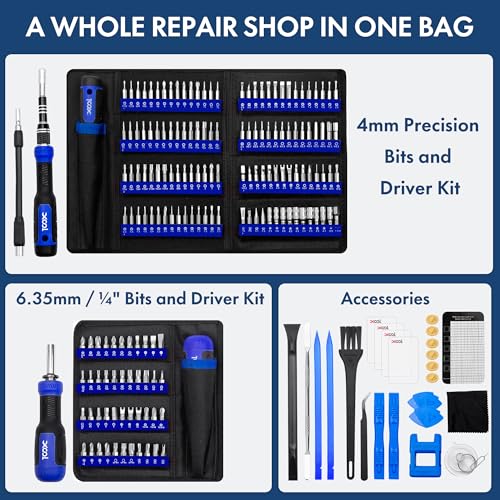 Kit de tournevis 200 en 1 – Ce kit de tournevis électronique comprend 2 manches de tournevis antidérapants, une pince antistatique de précision, une tige télescopique flexible, 164 têtes de tournevis, une tige télescopique solide, une ventouse en caoutchouc, une brosse de nettoyage noire, une palette à 14 triangles, 2 outils d’ouverture en plastique bleu à double extrémité et 2 outils d’ouverture pointus, un outil d’ouverture en métal, un aimant, un tampon magnétique et un sac en tissu Oxford. La meilleure combinaison – Ce kit de réparation électronique comprend 164 embouts différents, une tige flexible robuste, un outil d’ouverture, une pince ESD, etc. Il ne s’agit pas seulement d’un kit de réparation complet pour les téléphones portables, les montres, les lunettes, les appareils photo, les tablettes, les ordinateurs portables, les PC, les téléviseurs et autres appareils électroniques. L’embout de 1/4 de pouce peut être appliqué à diverses scènes de la vie. Matériaux de haute qualité – Tous les embouts sont fabriqués en acier CR-V de haute qualité par vulcanisation, leur dureté peut atteindre plus de HRC62°, ce qui est plus dur que l’acier ordinaire et plus durable. Tous les embouts de taille standard subissent des tests de contrôle de qualité rigoureux, la pointe est stable et ne s’enlève pas facilement. Conception humanisée – La poignée ergonomique et le design “press & push” permettent une prise en main confortable même pour une utilisation prolongée. Pour les embouts qui sont souvent utilisés dans la réparation des produits électroniques, ce set contient 2, 3 ou 4 embouts, ce qui vous permet d’éviter les dommages dus à une utilisation répétée et d’avoir à acheter un nouvel embout de remplacement, ce qui vous permet d’économiser de l’argent. Rallonge et arbre flexible – Il y a une tige d’extension réglable et un arbre flexible pour certains appareils électroniques où les vis ne sont pas sur la surface, vous n’avez plus besoin d’ouvrir laborieusement les vis à l’intérieur de la machine.