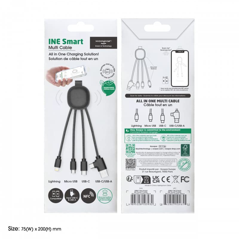 [🌿Communication Innovante et Ciblée :] Le INE smart est bien plus qu’un simple câble, il intègre une puce NFC pour une diffusion ciblée d’informations. Pas besoin de télécharger une application, il suffit de scanner le produit pour découvrir les informations pertinentes, une approche moderne et efficace. [🌿Polyvalent et Universel :] Ce câble multi-connecteurs est compatible avec une variété d’appareils, y compris smartphones, écouteurs sans fil, GoPro, et plus encore. Il offre une solution de charge et de transfert de données tout-en-un. [🌿Durable :] Le INE smart est fabriqué avec des matériaux respectueux de l’environnement. Il est composé de 31% de plastique recyclé, 17% de cuir recyclé et 52% de TPE recyclé. De plus, son packaging est en papier certifié FSC provenant d’une exploitation forestière gérée de manière durable, ce qui contribue à préserver notre planète. [🌿Garantie De Qualité :] Nous sommes confiants dans la durabilité de notre produit, c’est pourquoi nous offrons une garantie de 2 ans. Le INE smart est conçu dans une démarche de progrès pour répondre à vos besoins tout en respectant l’environnement. [🌿Compatible :] Ce chargeur de téléphone de 2,4 A est compatible avec iPhone 15 14 13 12 11, Pro, Pro Max Xs Max Xr X 8 7 6s 5s, iPad Pro, iPad Air, iPad Mini, iPad mini 2, iPad Air 2, iPod touch 5, compatible Nano 7, les appareils Samsung , Huawei , HTC, LG, Google et autres appareils Android/Apple. Il charge la plupart des téléphones mobiles.